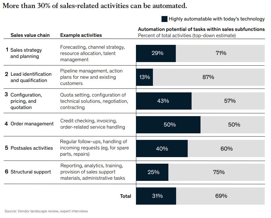 A automação de tarefas é uma das megatendências que moldam a economia global. Uma pesquisa do McKinsey Global Institute (MGI) indica que aproximadamente 33% das tarefas de vendas e operações de vendas podem ser facilmente automatizadas com a tecnologia atual (figura 1). Isso torna as vendas uma das funções mais promissoras em termos de potencial de automação.